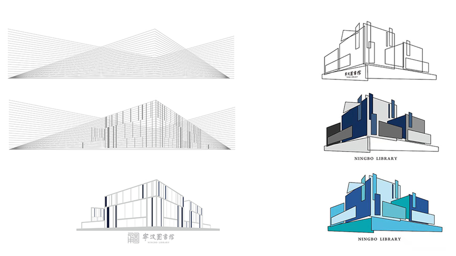 形式二:①利用建筑立面的縱橫透視線條,部分點綴深藍色的粗線條,塑造出圖書館嚴(yán)謹(jǐn)冷靜的一面,始終以一個堅定嚴(yán)肅的形象為廣大市民提供借閱服務(wù)。